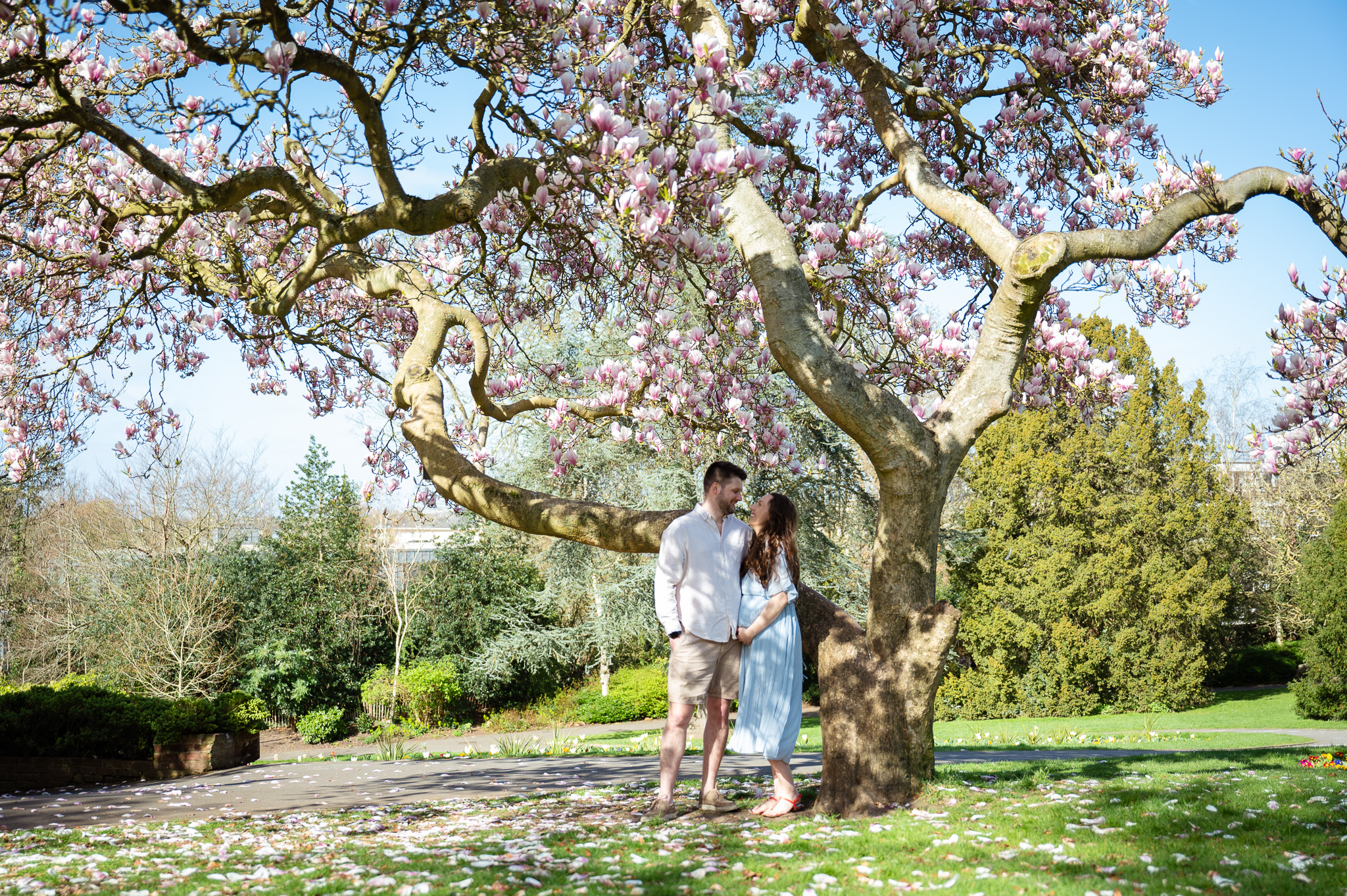 For couples, magnolia trees create a romantic setting that feels effortless and natural. A simple walk under blooming branches or sitting together beneath the tree can produce incredibly beautiful images.